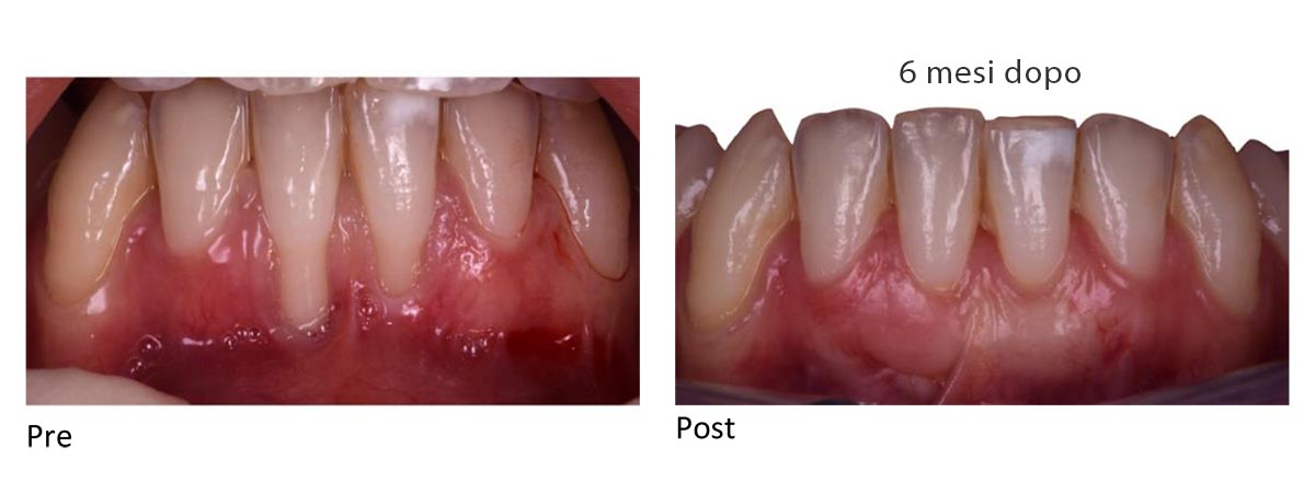 Ora ti mostro un prima-dopo di una profonda recessione su un incisivo inferiore, vediamo se indovini le cause… ti do un indizio: la giovane paziente aveva avuto l’ apparecchietto ai denti prima di rivolgersi al nostro studio (orto-perio).
