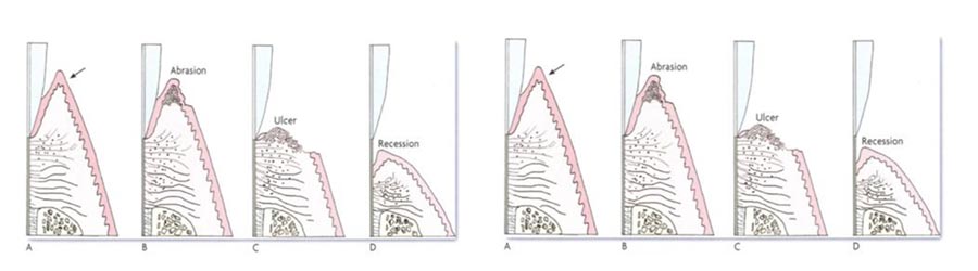 I meccanismi causati dalla placca e dal trauma, molte volte lavorando in sinergia (insieme), sono essenzialmente due: i batteri presenti nella placca producono delle tossine che determinano la distruzione delle fibre che uniscono la gengiva alla radice del dente portando osso e gengiva ad abbassarsi, a velocizzare il tutto un uso scorretto dello spazzolino può portare all’ abrasione del tessuto (gengiva) ulcerato velocizzando il processo di recessione (le gengive si abbassano ancora più rapidamente).